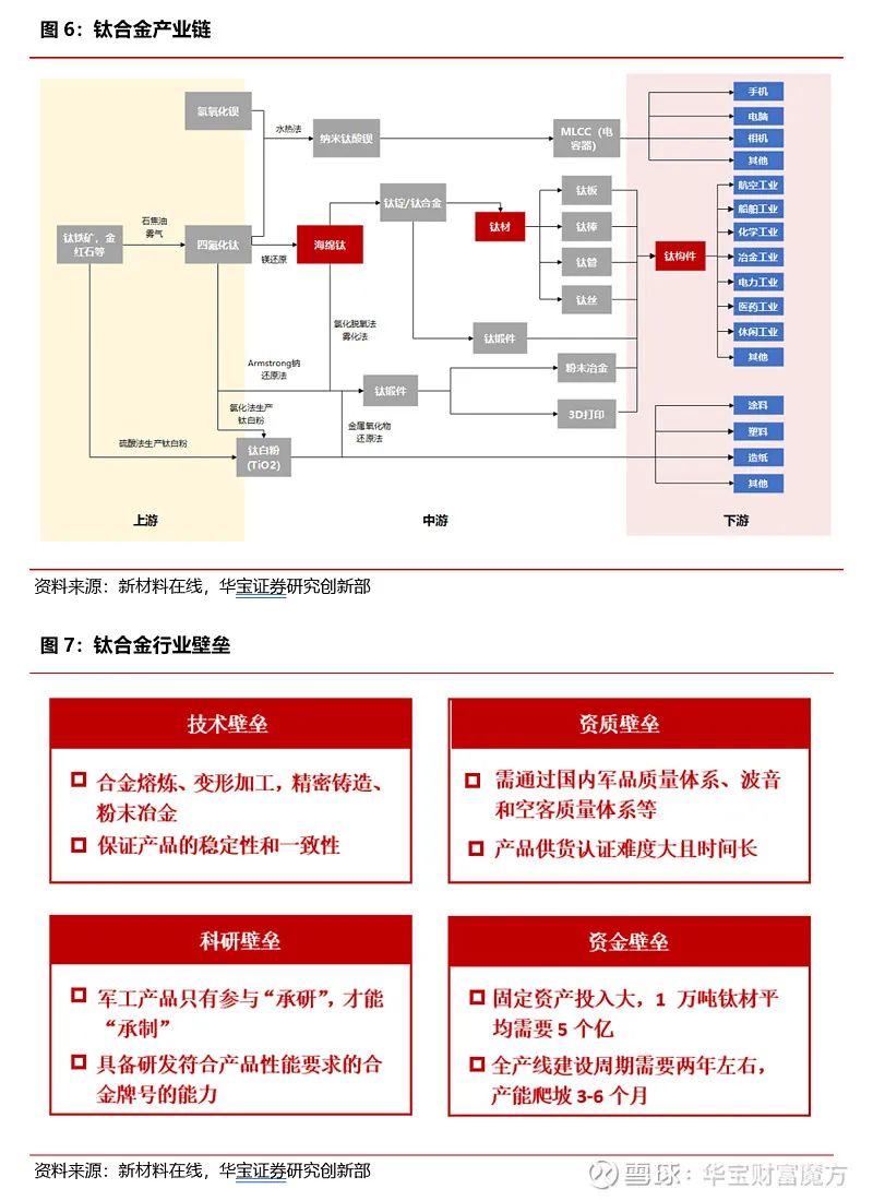 鈦合金的制備工藝較高溫合金簡(jiǎn)單,難點(diǎn)集中在海綿鈦和鈦材的制備。鈦材產(chǎn)業(yè)鏈的核心壁壘不在于上游資源和中游冶煉,而是在于鈦材的加工能力,尤其是高端鈦材的研發(fā)能力和制造工藝。鈦合金加工壁壘高筑,導(dǎo)致綜合壁壘亦較高,催生近乎雙寡頭競(jìng)爭(zhēng)格局。盡管原料金屬鈦價(jià)遠(yuǎn)低于鎳,但是基于鈦合金后端加工工藝復(fù)雜,最終部分鈦合金產(chǎn)品價(jià)格與高溫合金價(jià)格相當(dāng),甚至略高一籌。
