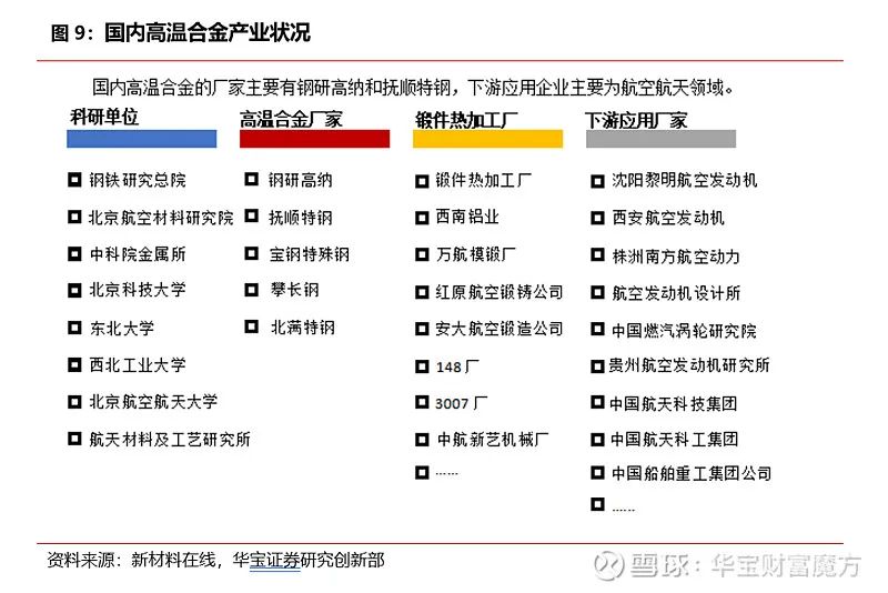 經(jīng)過50多年發(fā)展,我國(guó)已經(jīng)形成了比較先進(jìn),具有一定規(guī)模的生產(chǎn)基地。結(jié)合產(chǎn)業(yè)鏈各個(gè)環(huán)節(jié)相關(guān)參與方來看,目前我國(guó)生產(chǎn)廠商集中在航空航天領(lǐng)域用量最大的變形高溫合金冶煉和鍛造環(huán)節(jié),因此在大批量生產(chǎn)高溫合金母合金、板、棒、鍛材上有很大的優(yōu)勢(shì)。